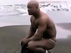 Asian bodybuilder barely covered at the beach